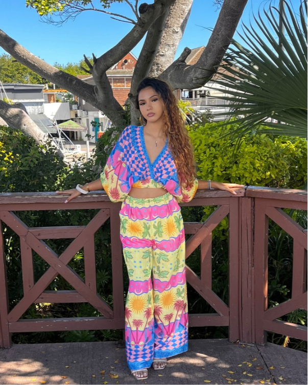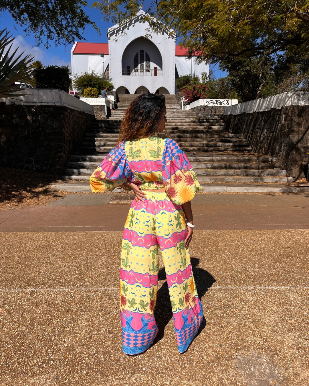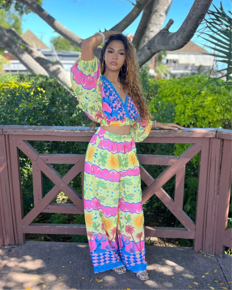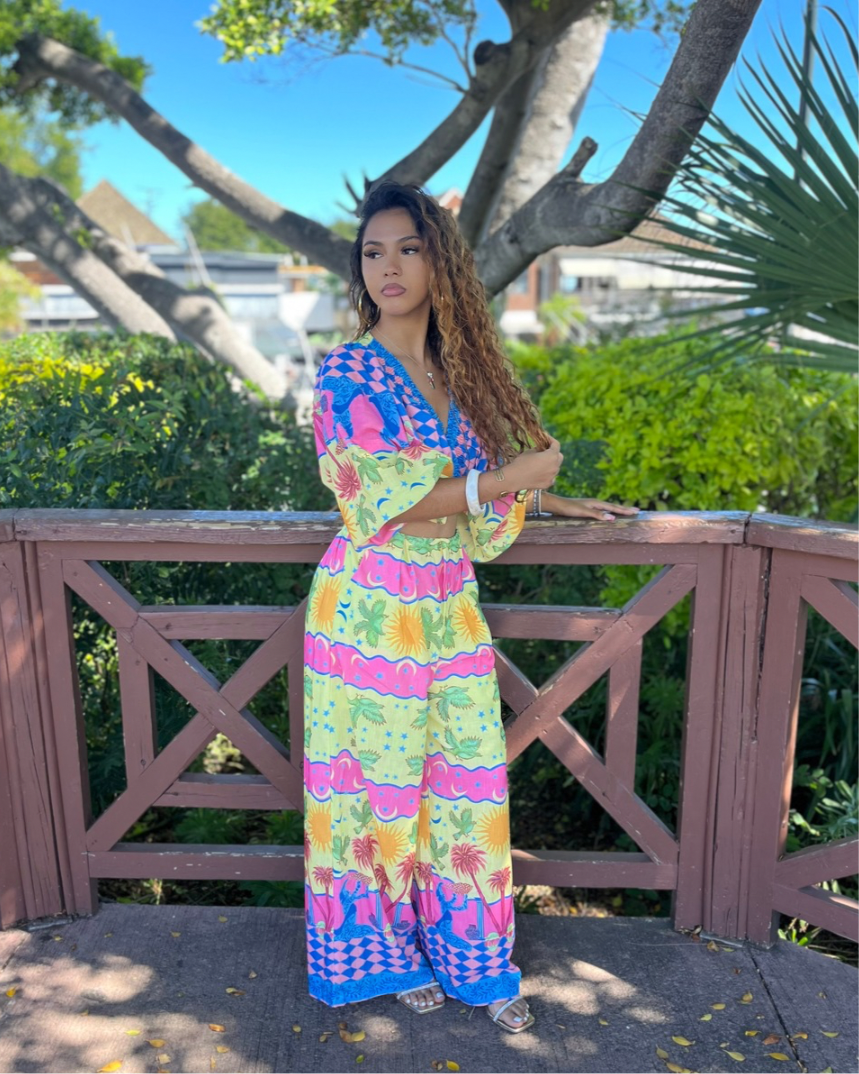 Le haut est croisé avec un joli décolleté en V et des manches amples pour un effet bohème-chic. Le pantalon oversize, taille haute, est doublé jusqu’à mi-cuisse pour éviter toute transparence et offre un élastique à l’arrière pour un confort optimal et un ajustement parfait à la taille.