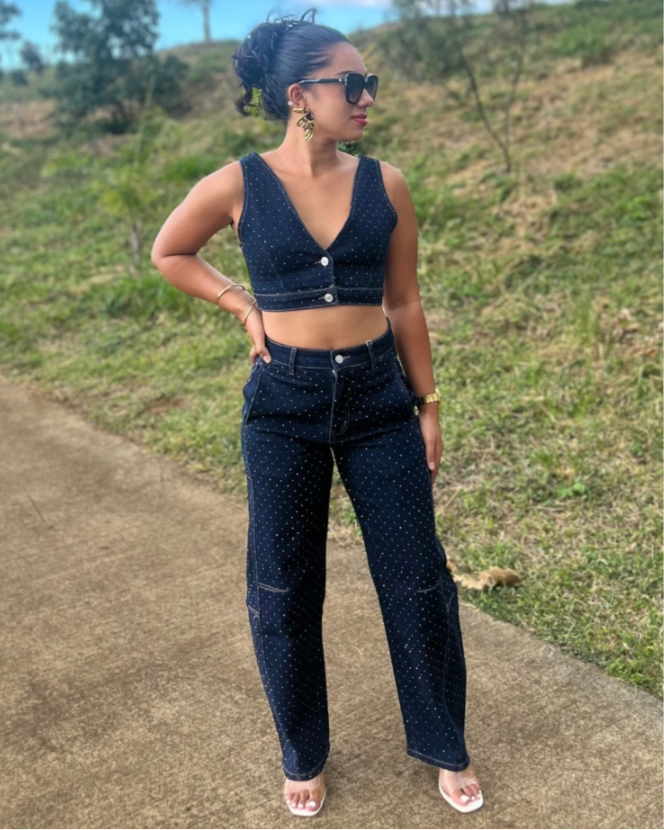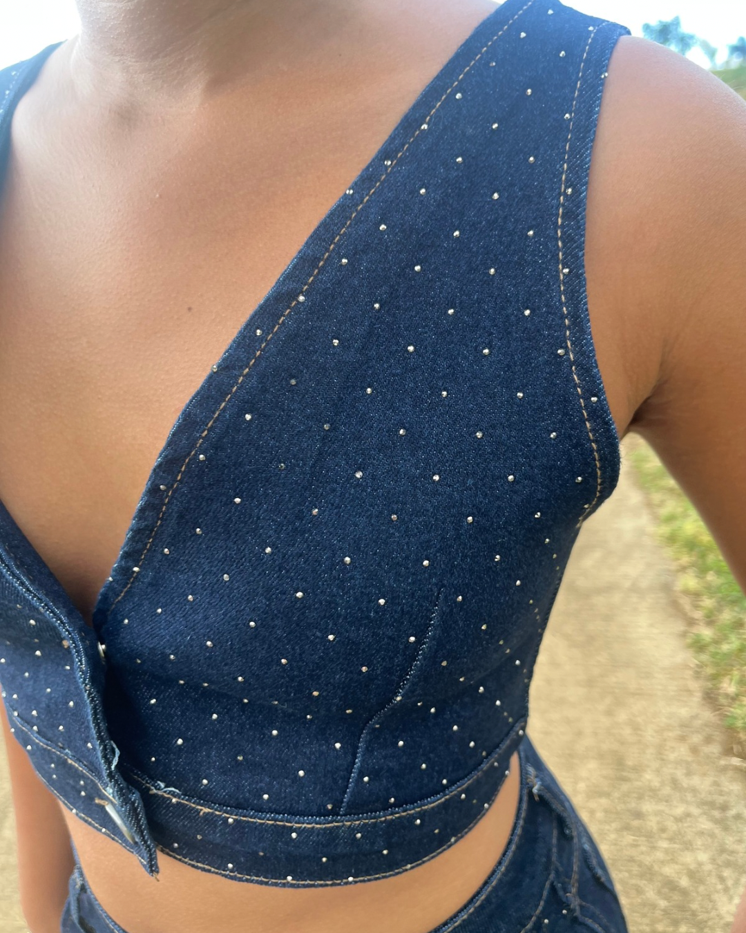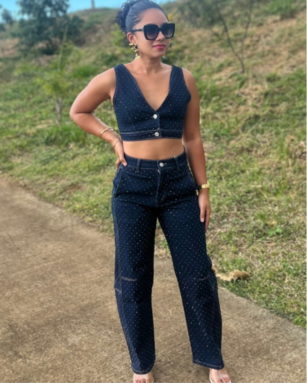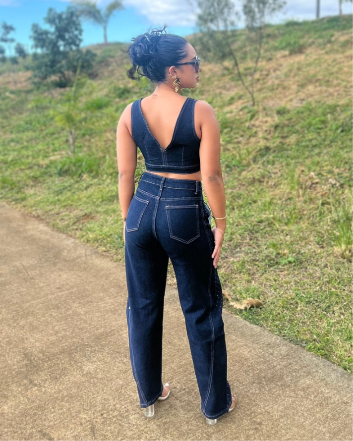 Craquez pour cet ensemble Mila en denim revisité, composé d’un crop top sans manches à la coupe moderne et d’un pantalon barrel taille haute, la forme la plus en vogue du moment. Les détails cloutés et les légères traces sur l’avant apportent une touche mode affirmée et contemporaine.