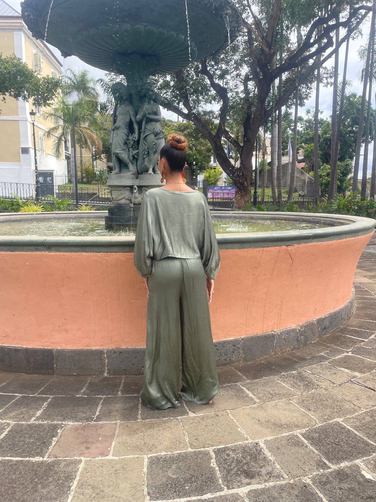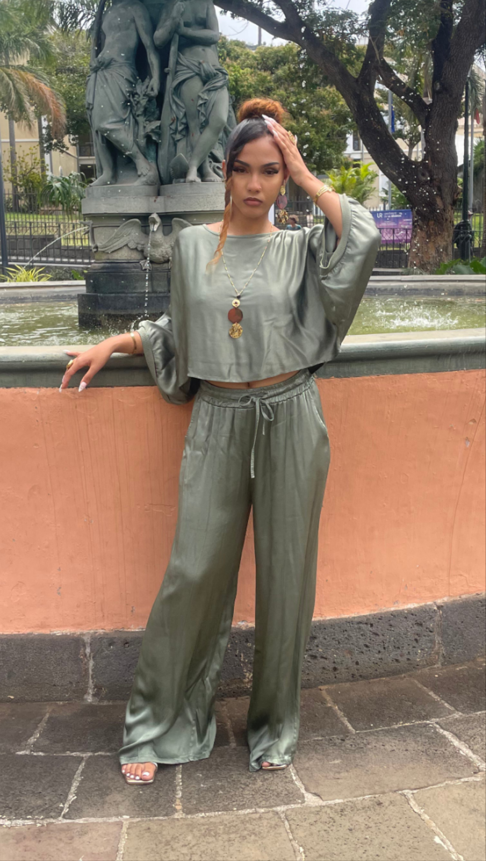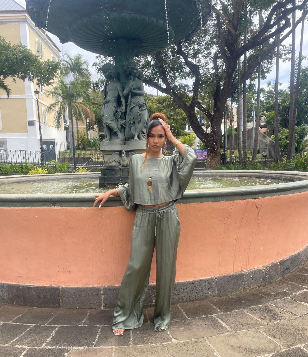 Confectionné en viscose et rayonne, cet ensemble fluide se distingue par sa coupe ample et son tombé soyeux. Le haut à manches larges laisse apparaître subtilement la taille, tandis que le pantalon large offre confort et allure.