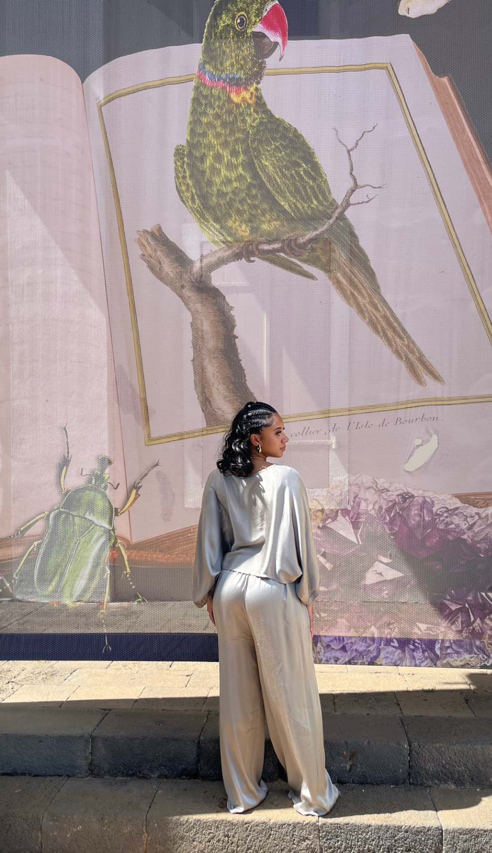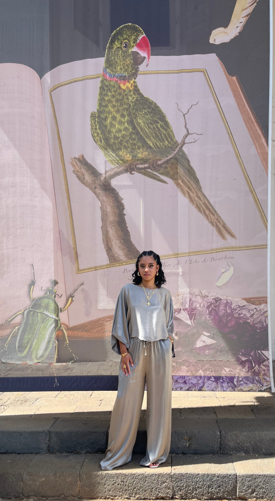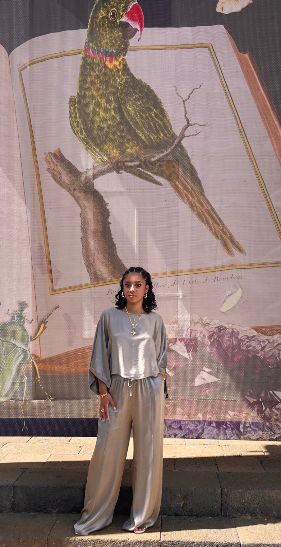 Confectionné en viscose et rayonne, cet ensemble fluide se distingue par sa coupe ample et son tombé soyeux. Le haut à manches larges laisse apparaître subtilement la taille, tandis que le pantalon large offre confort et allure.