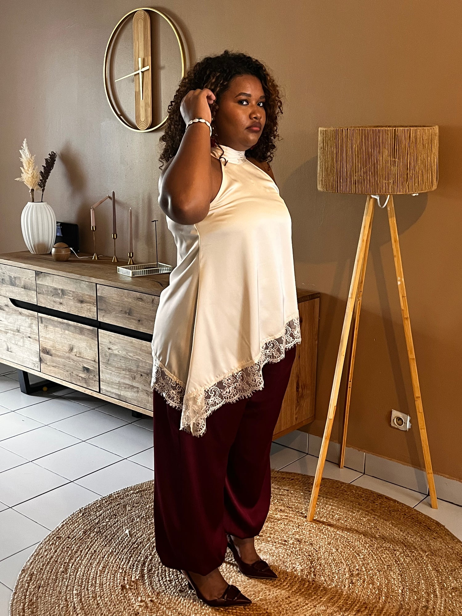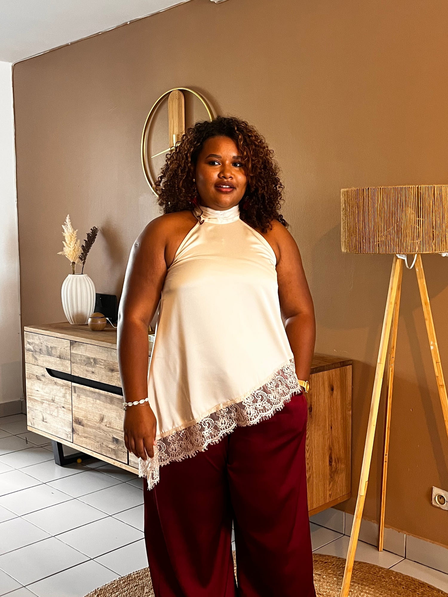 Ce superbe haut au col montant sublime la silhouette avec une touche de chic intemporel. Son bas asymétrique orné de délicate dentelle apporte une note féminine et raffinée, tandis que sa matière épaisse et de qualité assure confort et tenue parfaite. Un modèle à la fois classe et audacieux, idéal pour sublimer vos looks du quotidien ou vos soirées. 💫