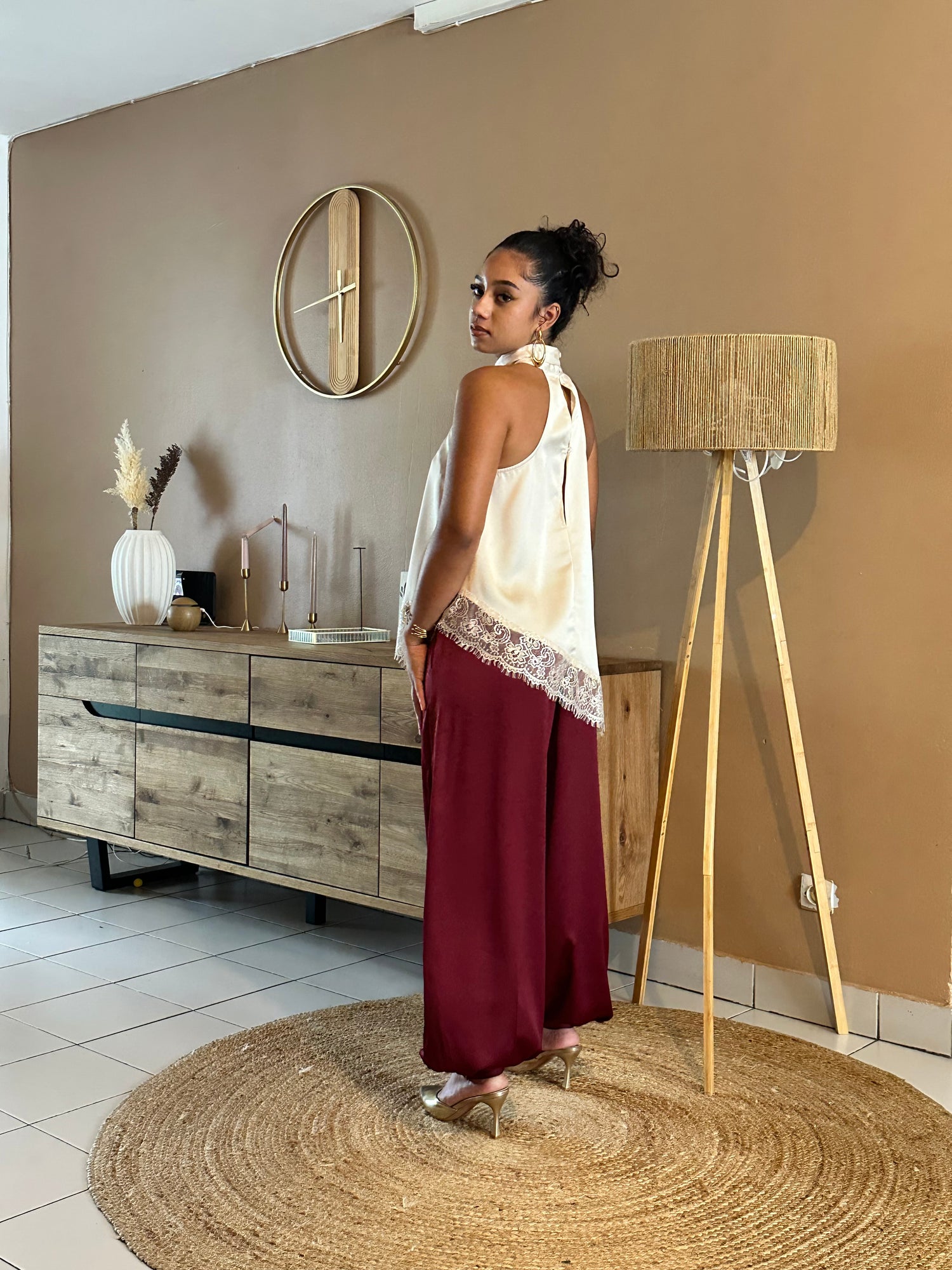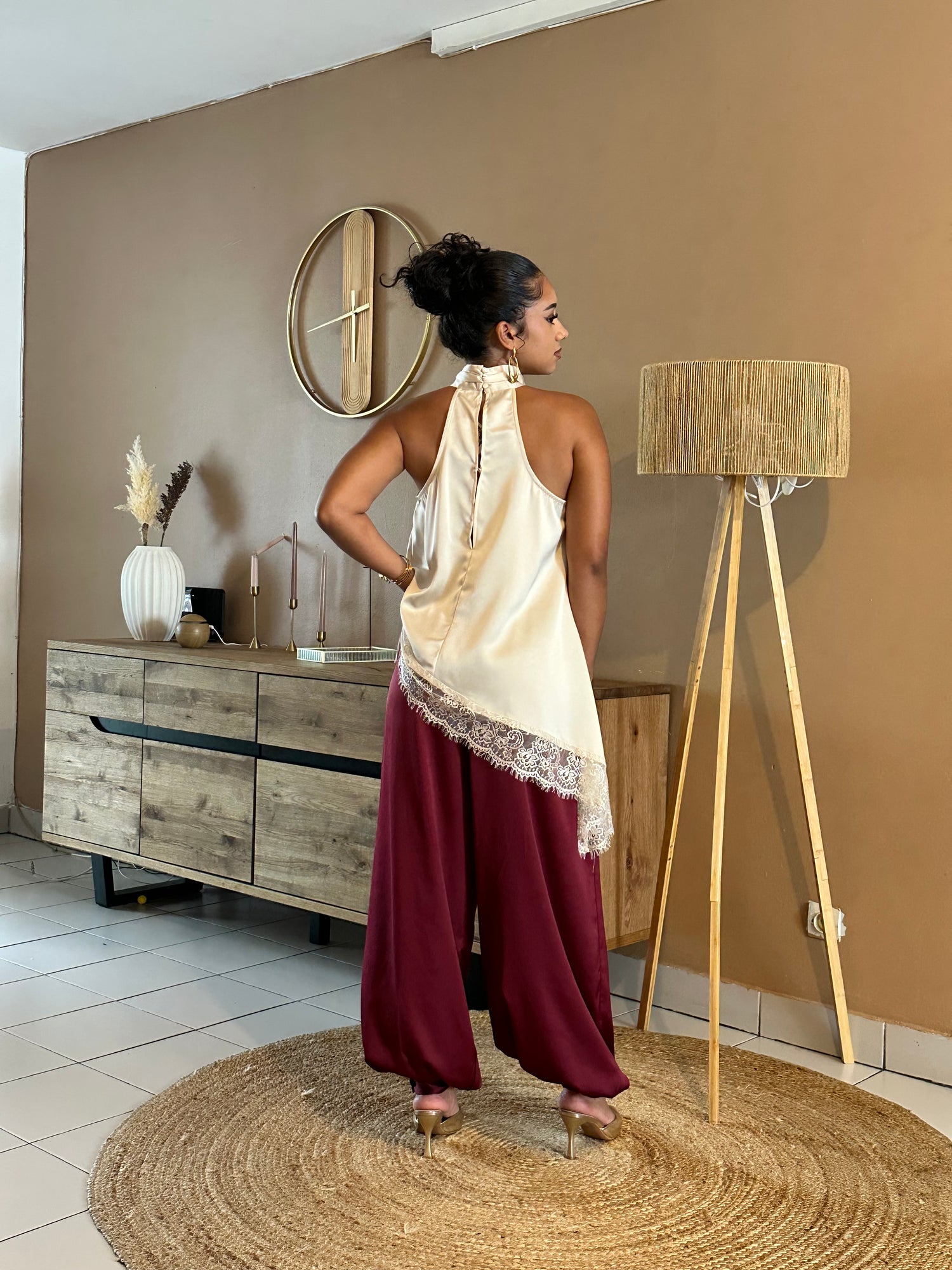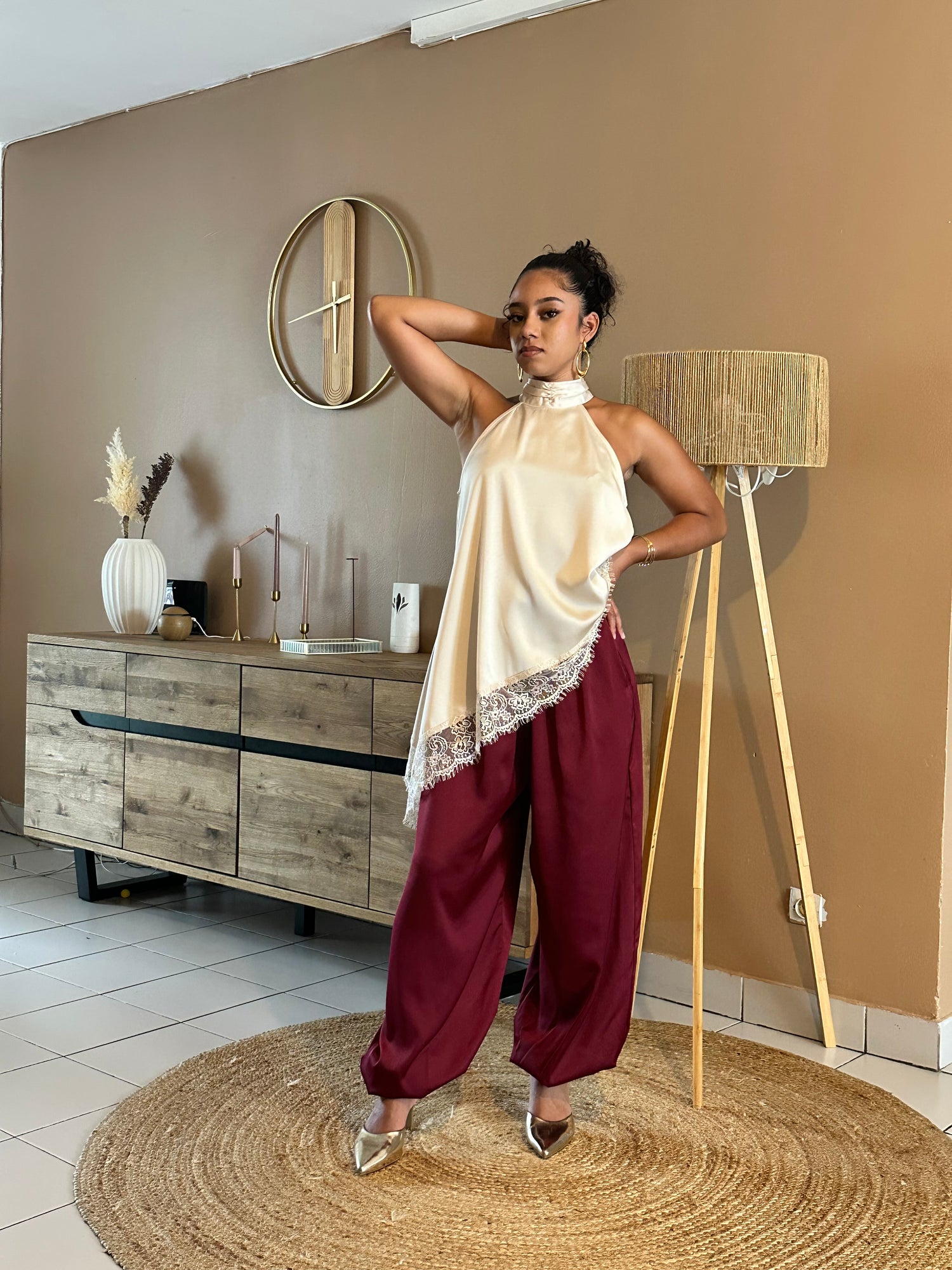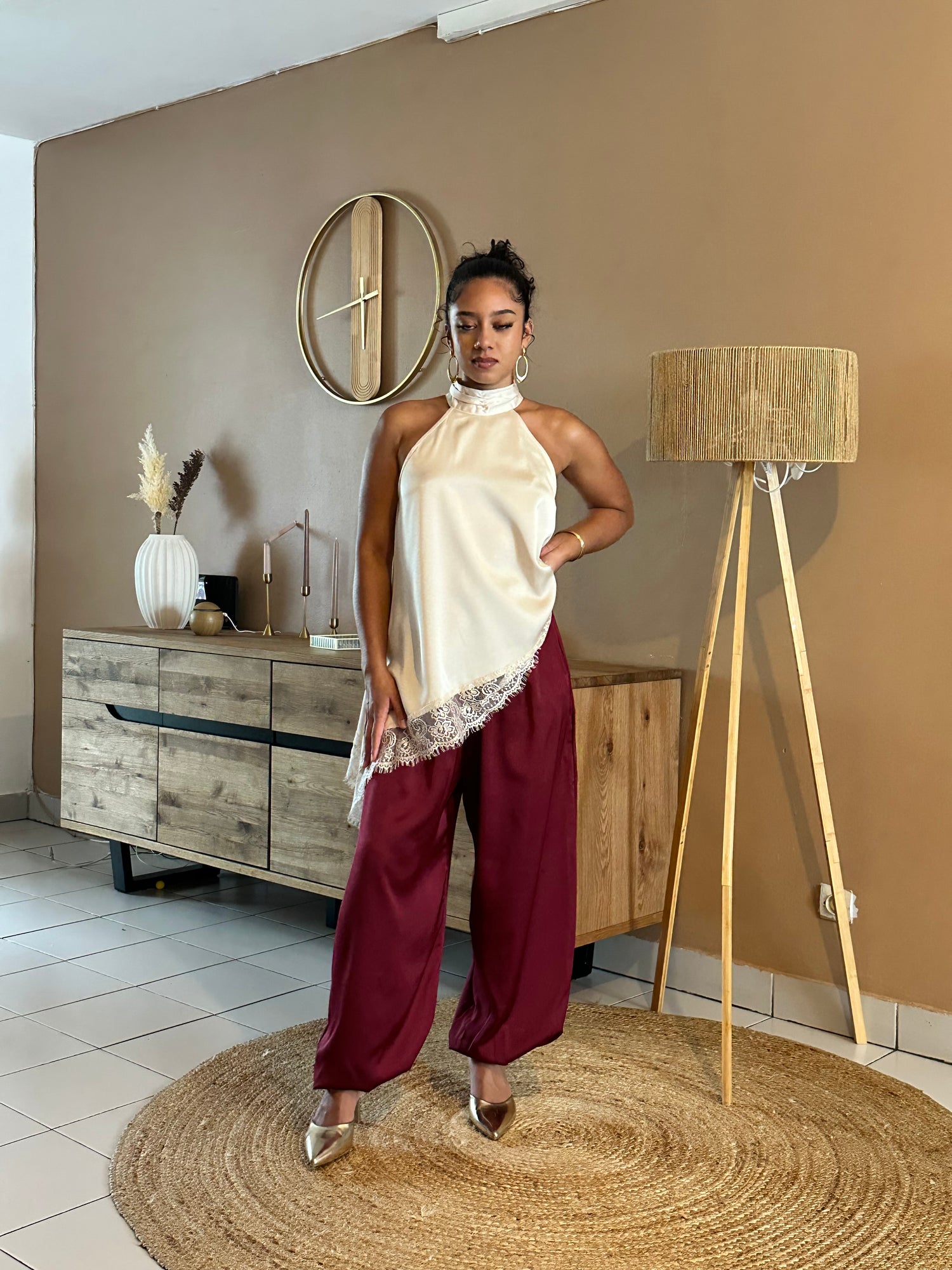 Laissez-vous séduire par l’allure chic et sensuelle de ce pantalon bouffant au tombé satiné. Sa taille élastique souligne délicatement la silhouette tout en offrant un confort absolu. On adore son volume élégant, ses poches pratiques et sa finition resserrée aux chevilles ornée de deux jolis boutons — un détail qui fait toute la différence. Un tissu épais et doux au toucher, pour un style à la fois glamour et décontracté… irrésistible jour comme nuit.