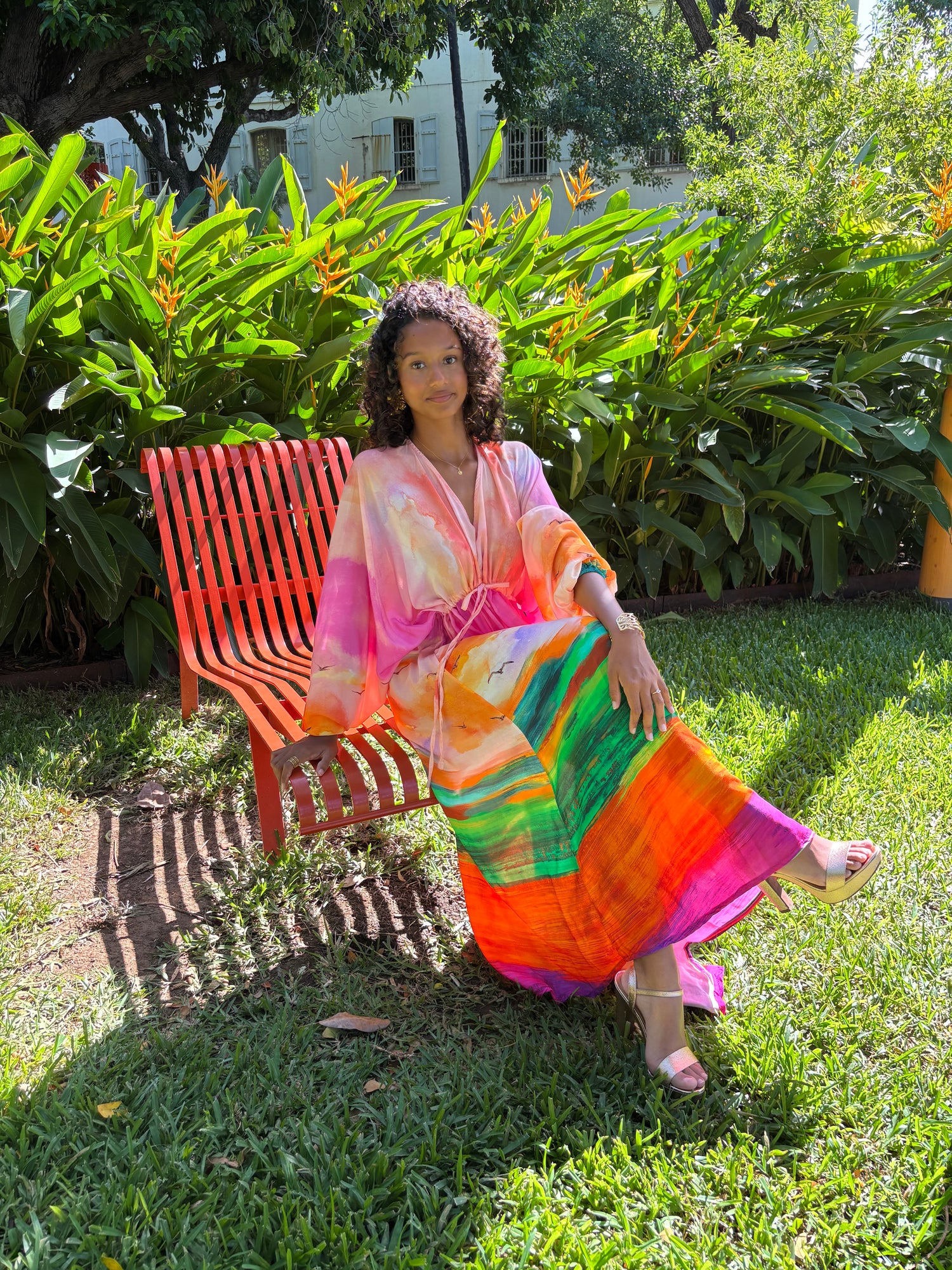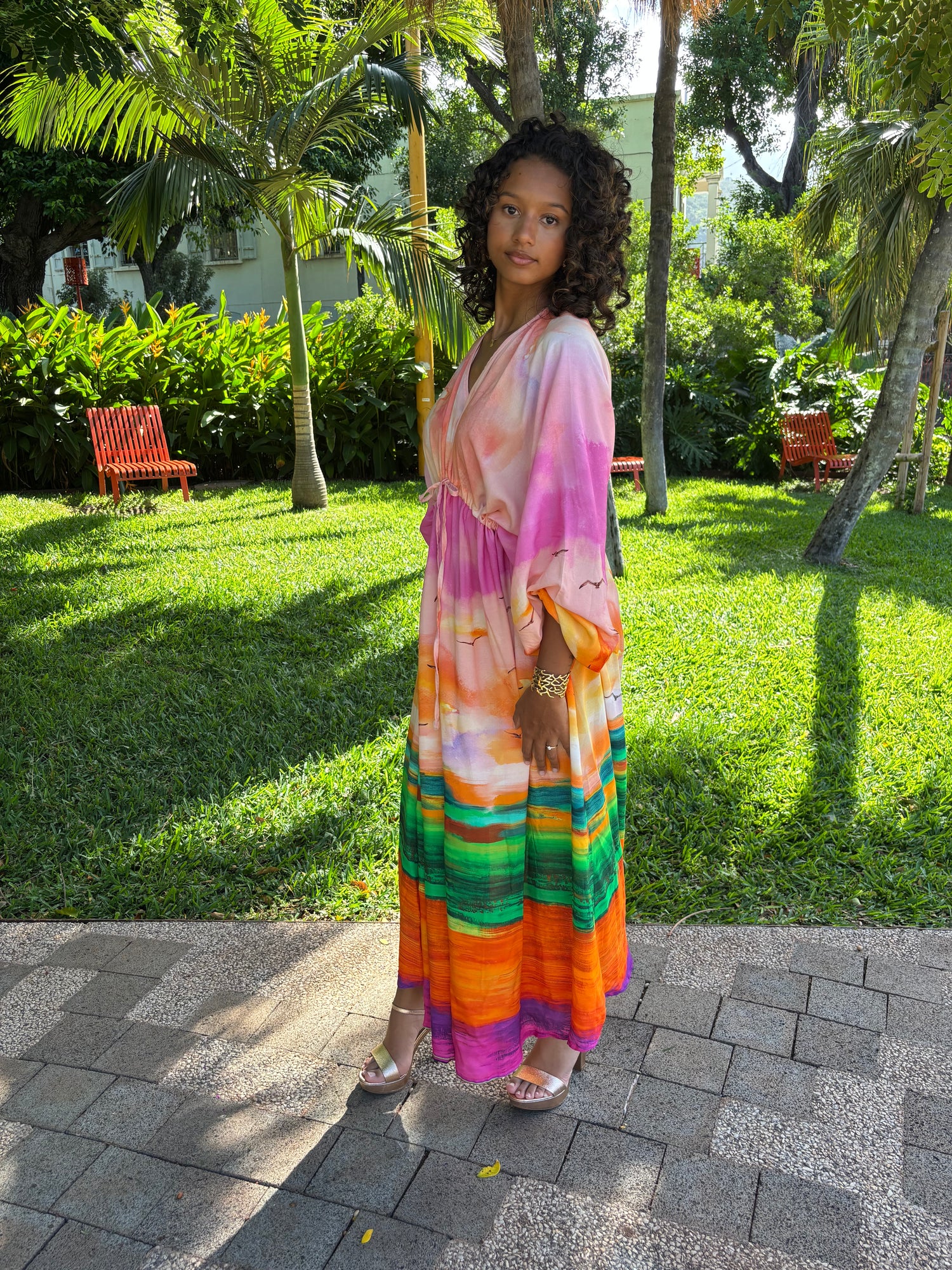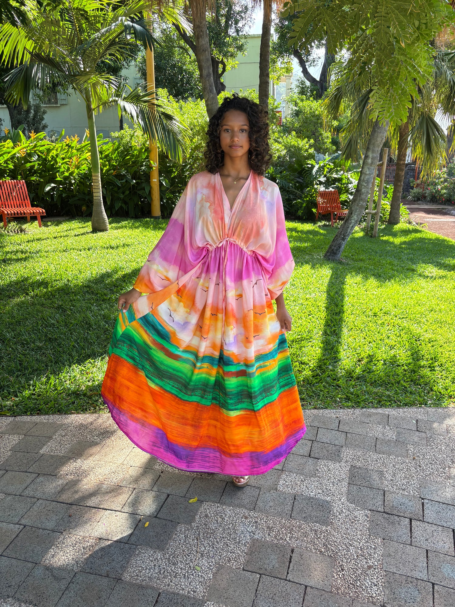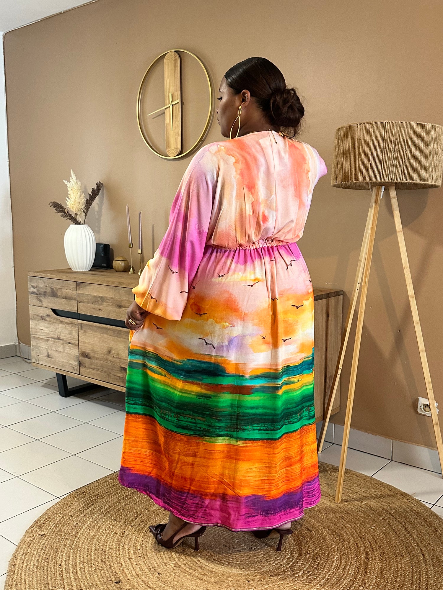 🌈 Évadez-vous avec cette robe Aurore spectaculaire, une véritable œuvre d'art à porter. Ses couleurs éclatantes et son motif panoramique évoquent la douceur d'un coucher de soleil sur l'océan, apportant une énergie rayonnante à votre allure.