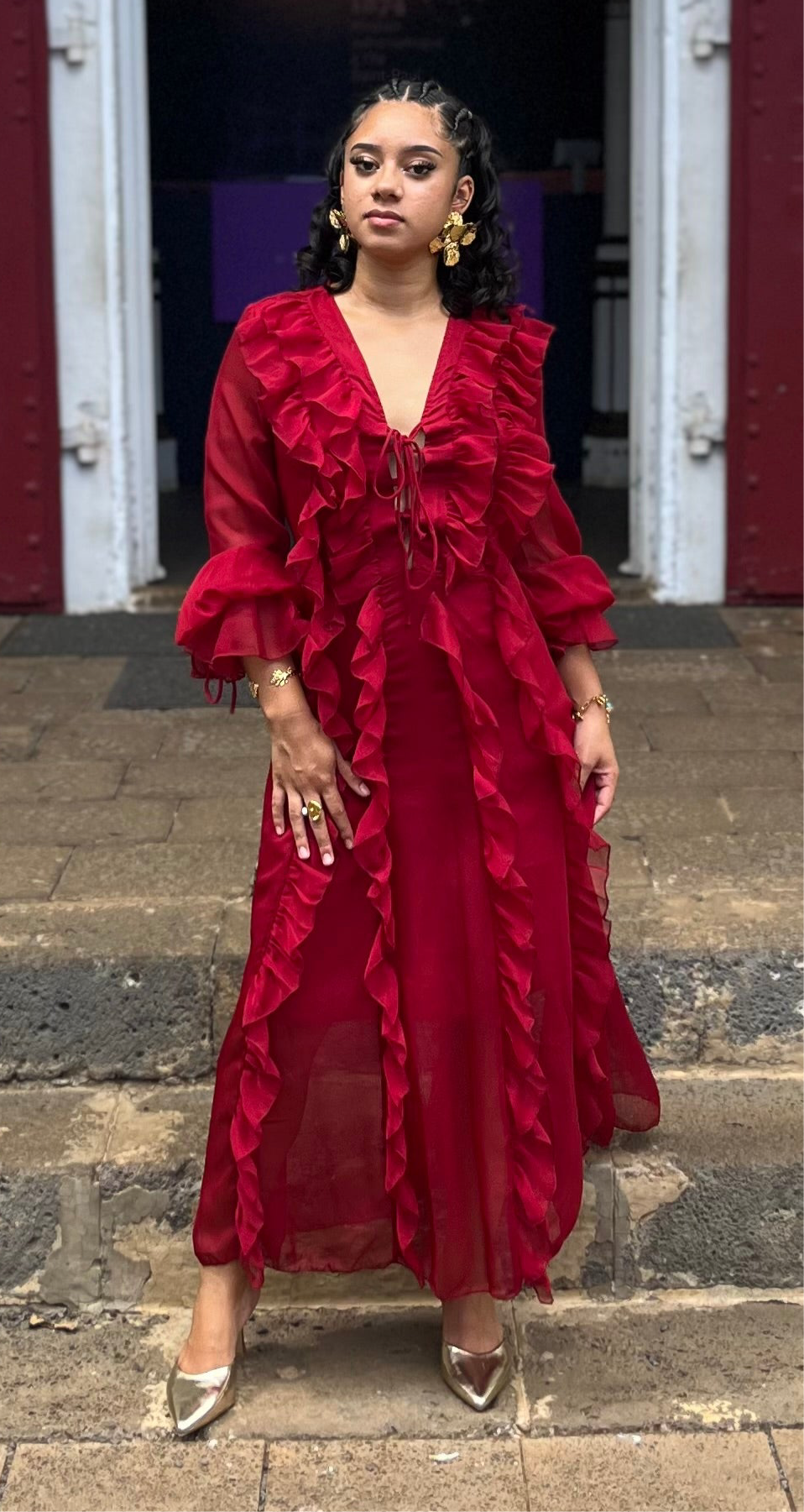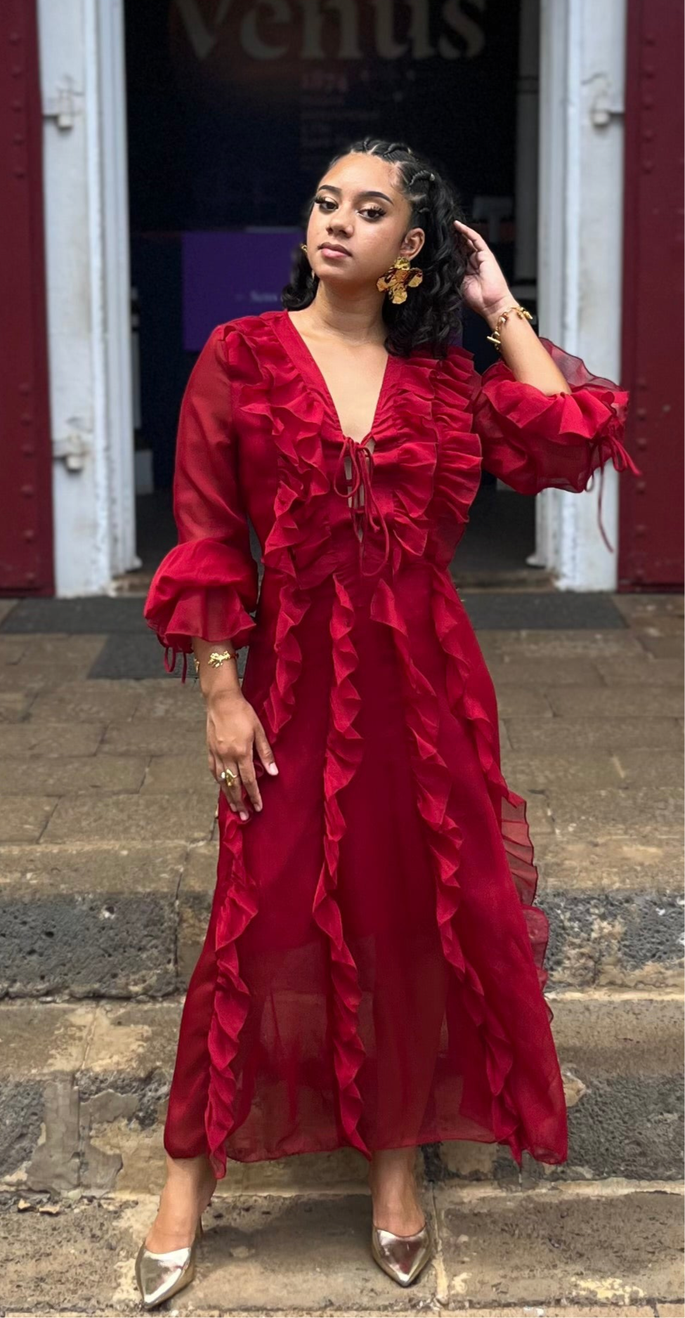 Pas question de se fondre dans la foule : avec son rouge vibrant, ses volants légers et son laçage délicat, cette robe est faite pour celles qui aiment captiver. Elle bouge avec toi, elle attire les regards, et elle a ce petit “je ne sais quoi” qui fait toute la différence.